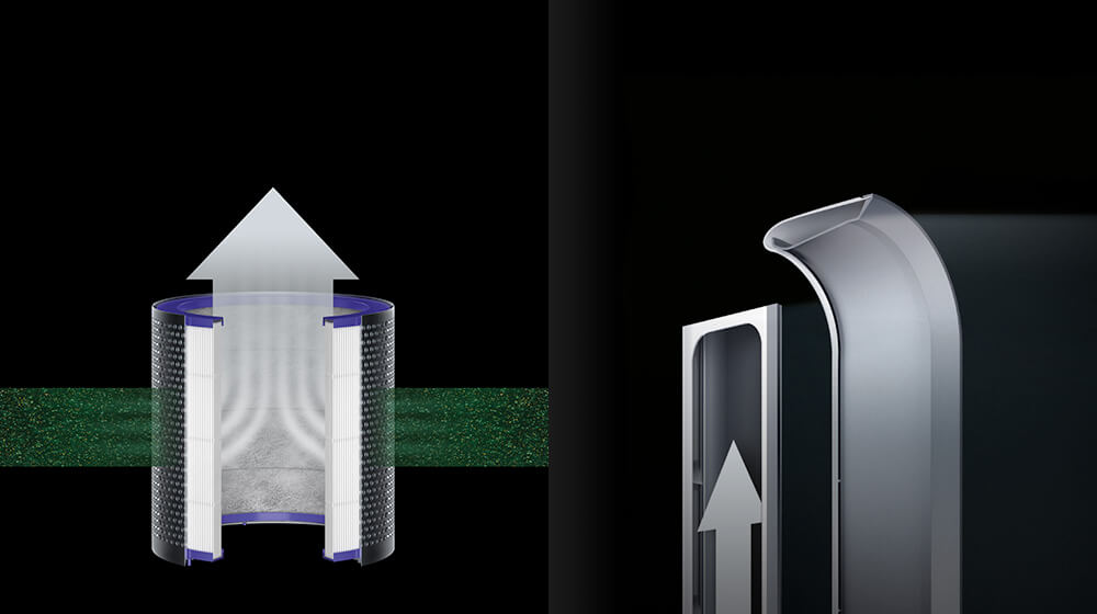 Dyson Pure Cool™ 氣流倍增器技術針對移除 99.95% 小至 PM0.1的微粒所設計。 它有低面風速。搭配高效率 HEPA 的過濾網,能把小至 PM0.1 的有害細懸浮微粒緊緊捕捉在濾媒中。
