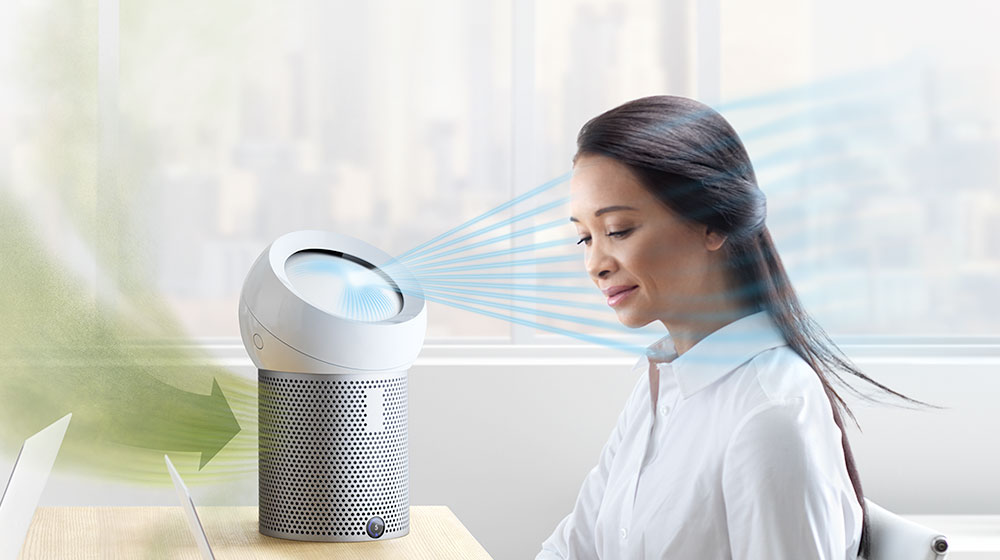 An office worker using a Dyson Pure Cool Me personal purifier fan
