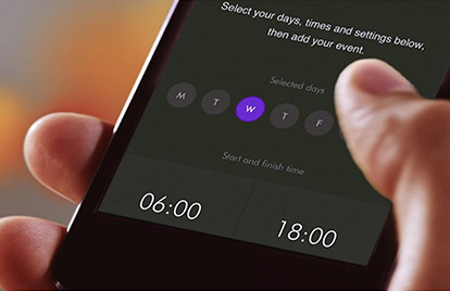 使用Dyson Link應用程式選擇機器的開關時間,最早可在七天前設定。