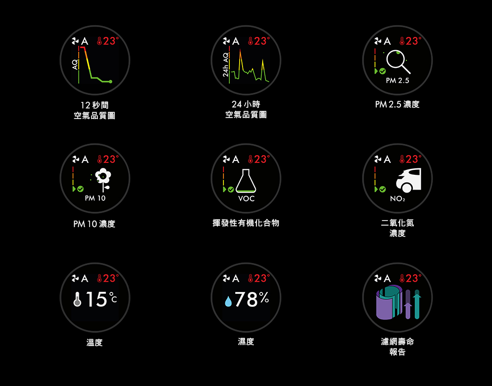 內置 LCD 屏幕顯示當前室內濕度,以及偵測空氣中懸浮微粒及有害氣體。