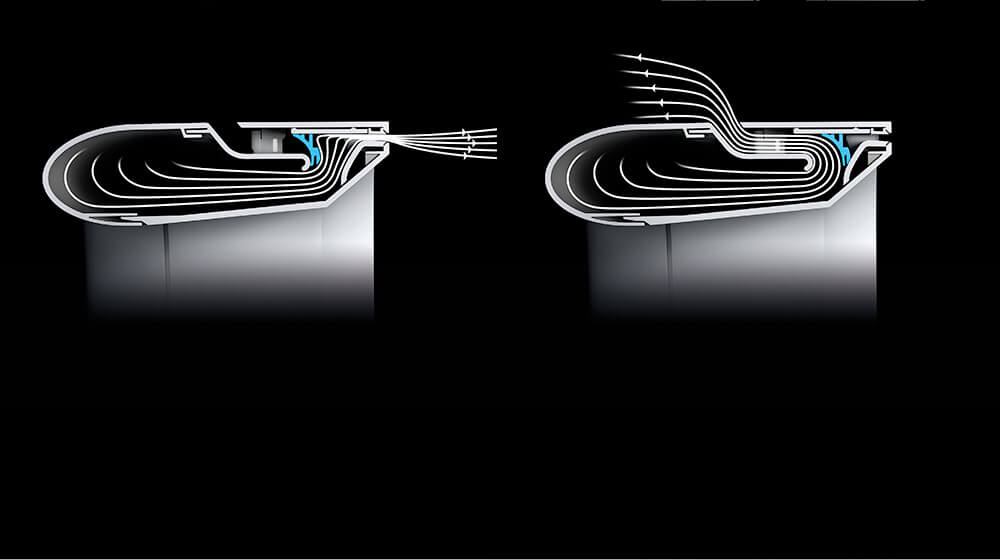 擋板向後移動以阻擋前氣口,空氣以45°度角從環形的後部噴射,形成更加廣角的氣流。由於廣角氣口更寬,只需使用少能量便能運行,而且更寧靜,保持最佳淨化效果,絕對沒有處在風口上的感覺。