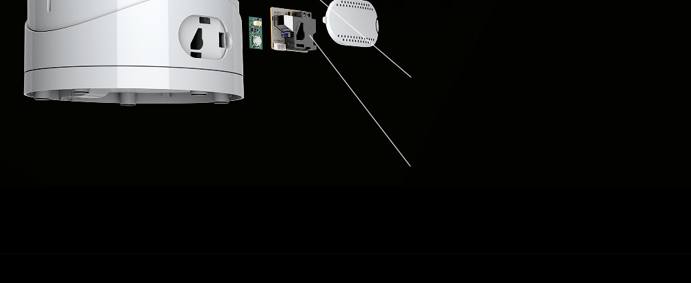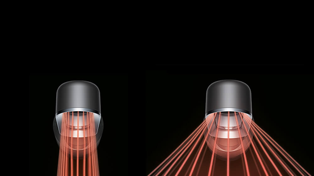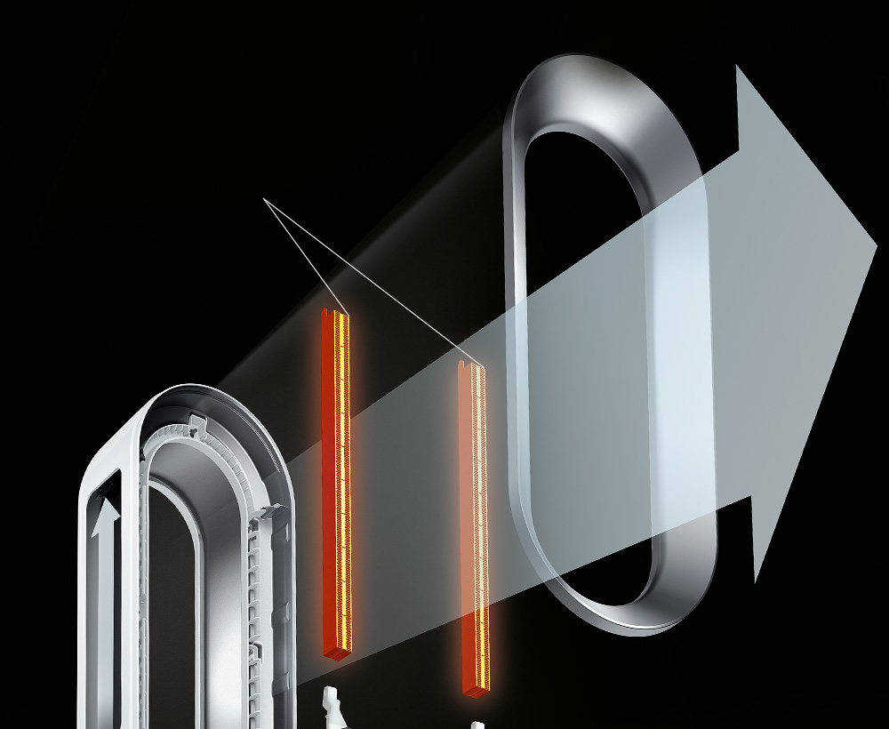 氣流從第二個氣孔噴出。當兩股噴射氣流相遇時,加氣效應會導引氣流越過一個45°的氣流投射器,釋出廣角強力氣流。