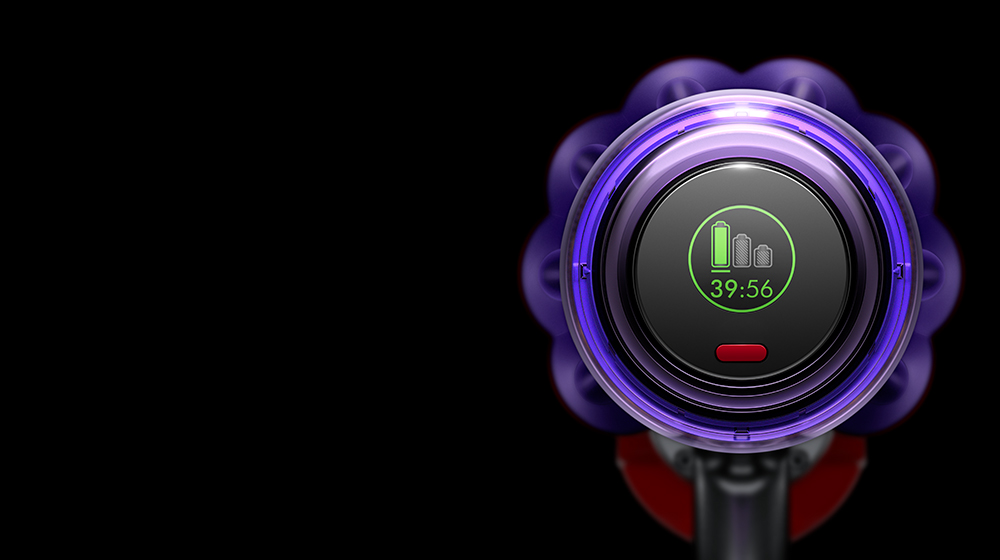 LCD螢幕顯示目前效能,包括所選吸力模式、剩餘使用時間、濾網保養提醒及阻塞報告。