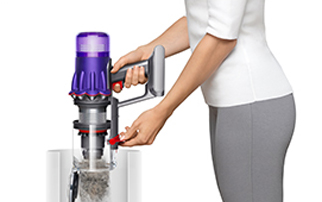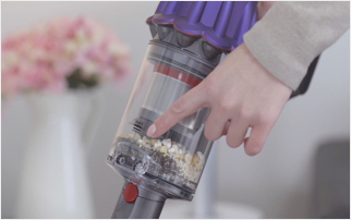 若要清空集塵筒,請取下延長管,然後按下紅色釋放桿以倒出塵垢。集塵筒拆除簡單,方便用無棉絮濕布清潔。查看如何操作。