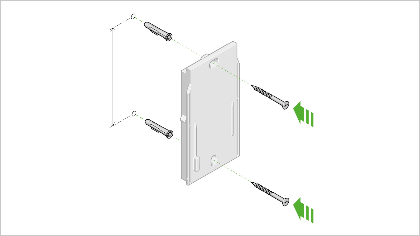 在建議最低高度處,利用背板上兩個小孔在牆上畫下鑽孔位置。使用隨附的2個塑膠釘套和2個螺絲將背板固定到牆上。