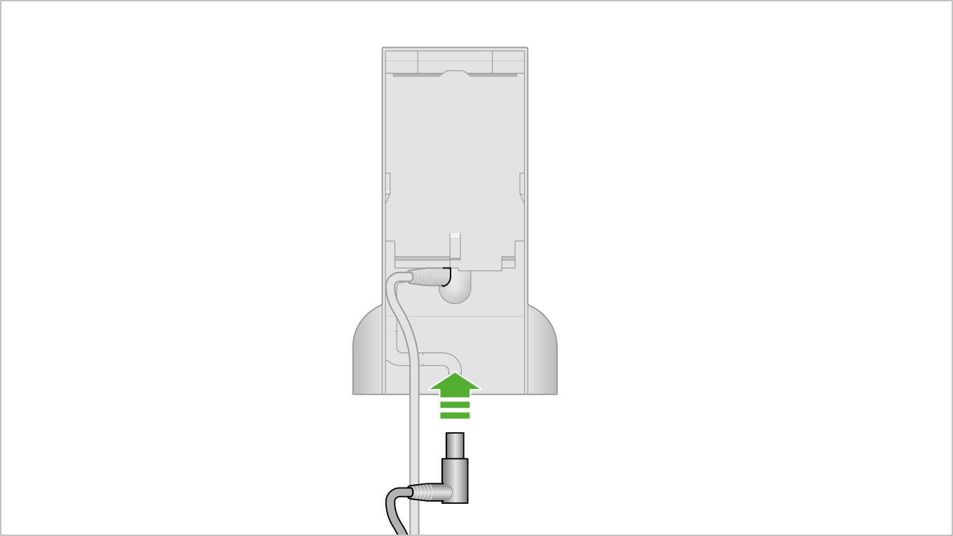 將充電線接頭穿過充電架後面的孔。接著放置接頭蓋,使其固定到位。