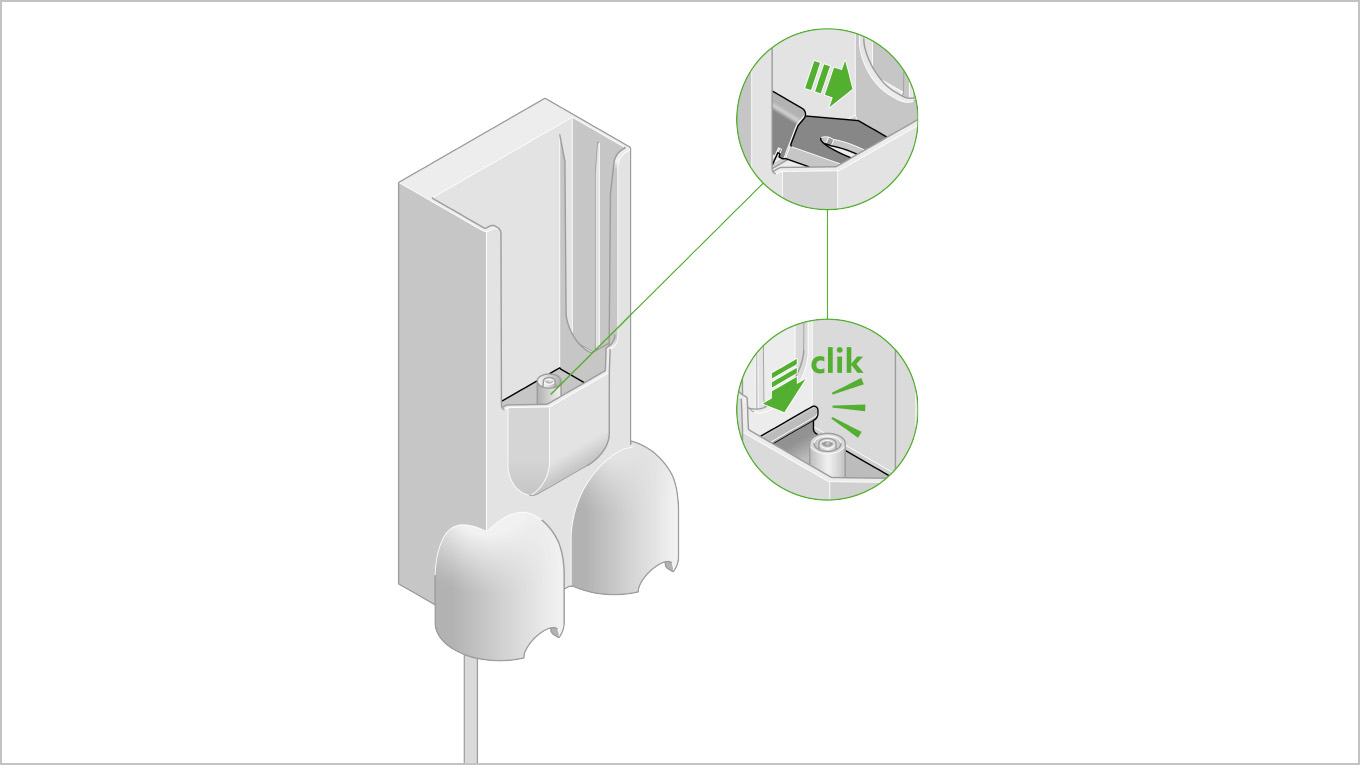 將充電壁掛底座滑到背板上。將插頭插入前殼體。務必將充電線固定在前殼體後方。