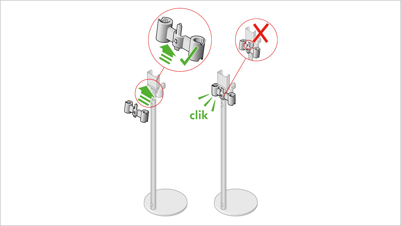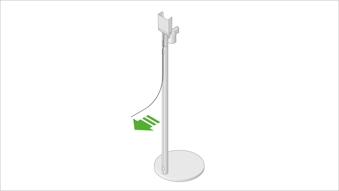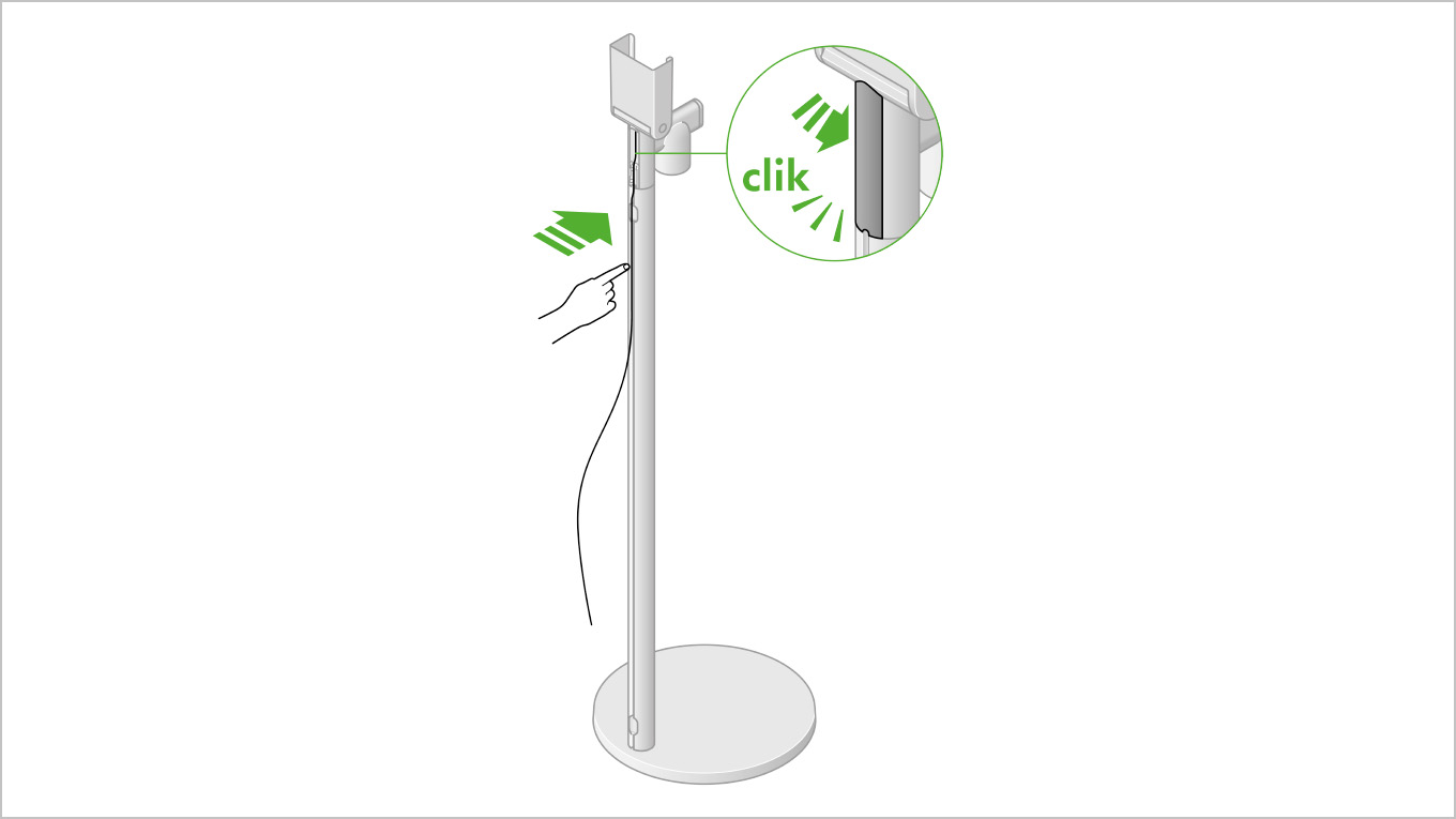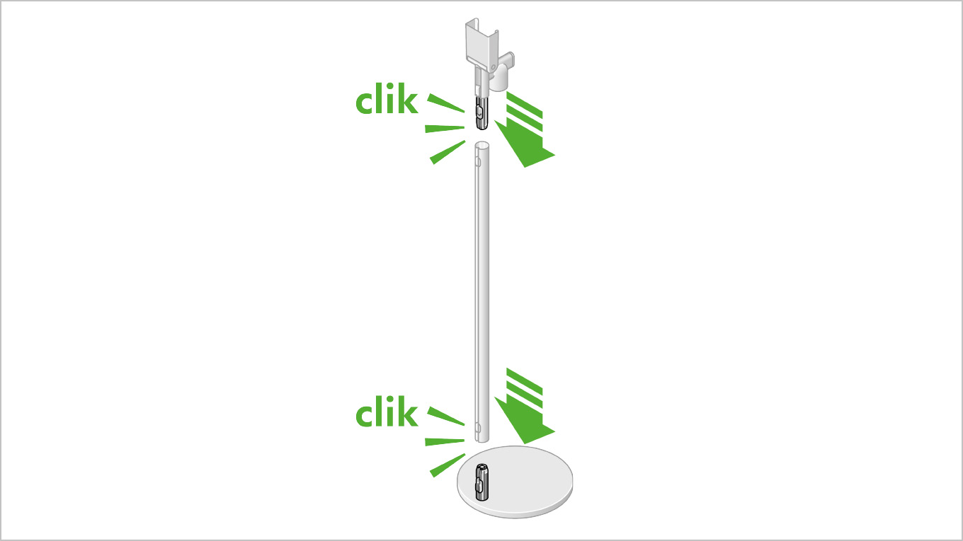 將底座組放在方便使用的位置。將垂直主桿卡入到位。接著將充電架卡入頂部位置。