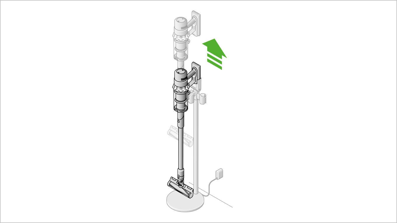 按壓插孔蓋以牢牢固定插頭。打開電源,將您的Dyson Gen5Detect™ 無線吸塵器安裝於充電壁掛底座上開始充電。