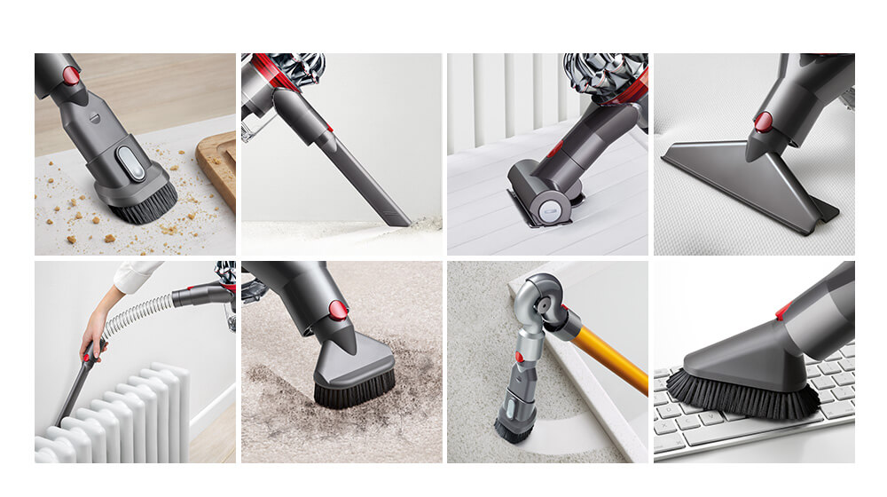 專為提升戴森 V8 無線吸塵器的清潔效能而研發,每款吸頭及配件均有特定功能,可全面吸除每個角落的塵垢。